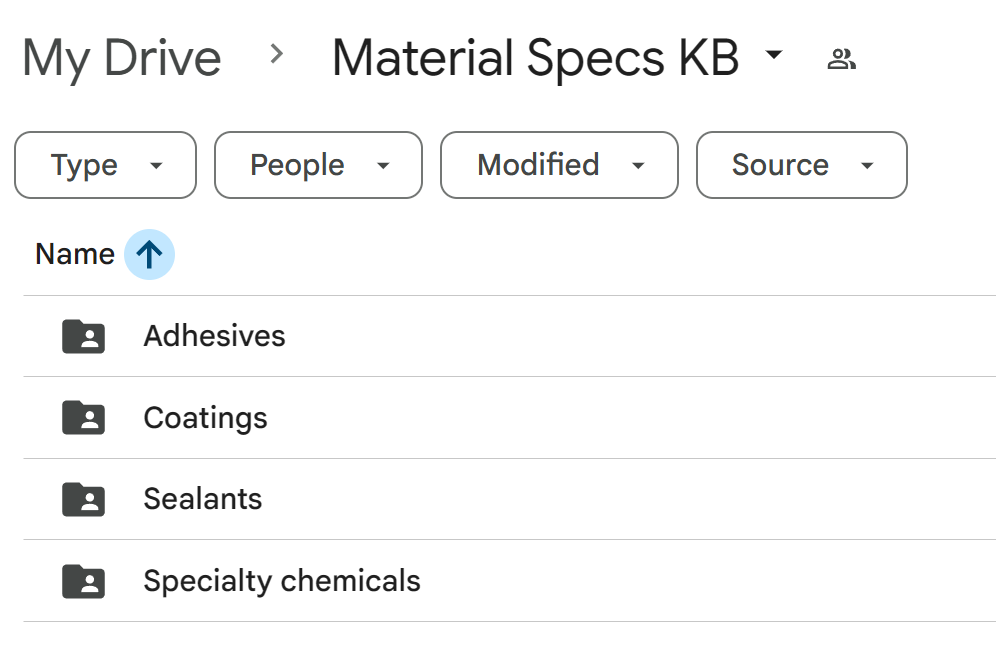 Documents were stored in a structured Google Drive folder (Material Specs KB) with subfolders by category. The folder is shared with a service credential, allowing the RAG pipeline to ingest directly from Drive without manual uploads.