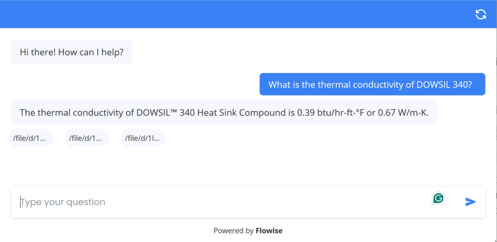 - Live demo (suggested questions: Which products are suitable for high temperature applications? or What is the thermal conductivity of DOWSIL 340?)
